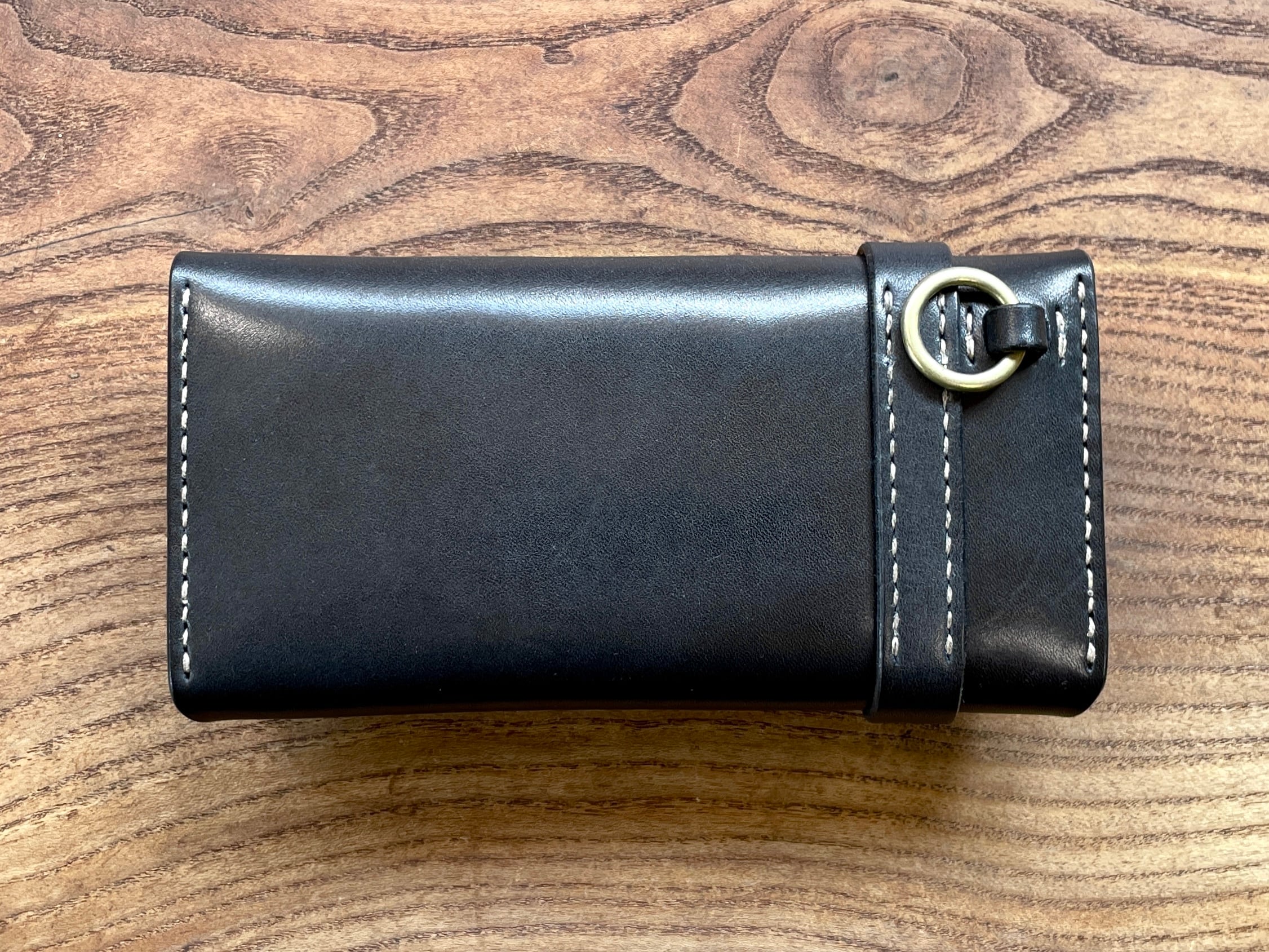 長財布の中では小ぶりな190mmサイズ。耐久性のある厚手な革を使った、バイク乗りのハードな使用に向けたモデル。かぶせ(フタ)はベルトを差し込んでしっかり留まります。