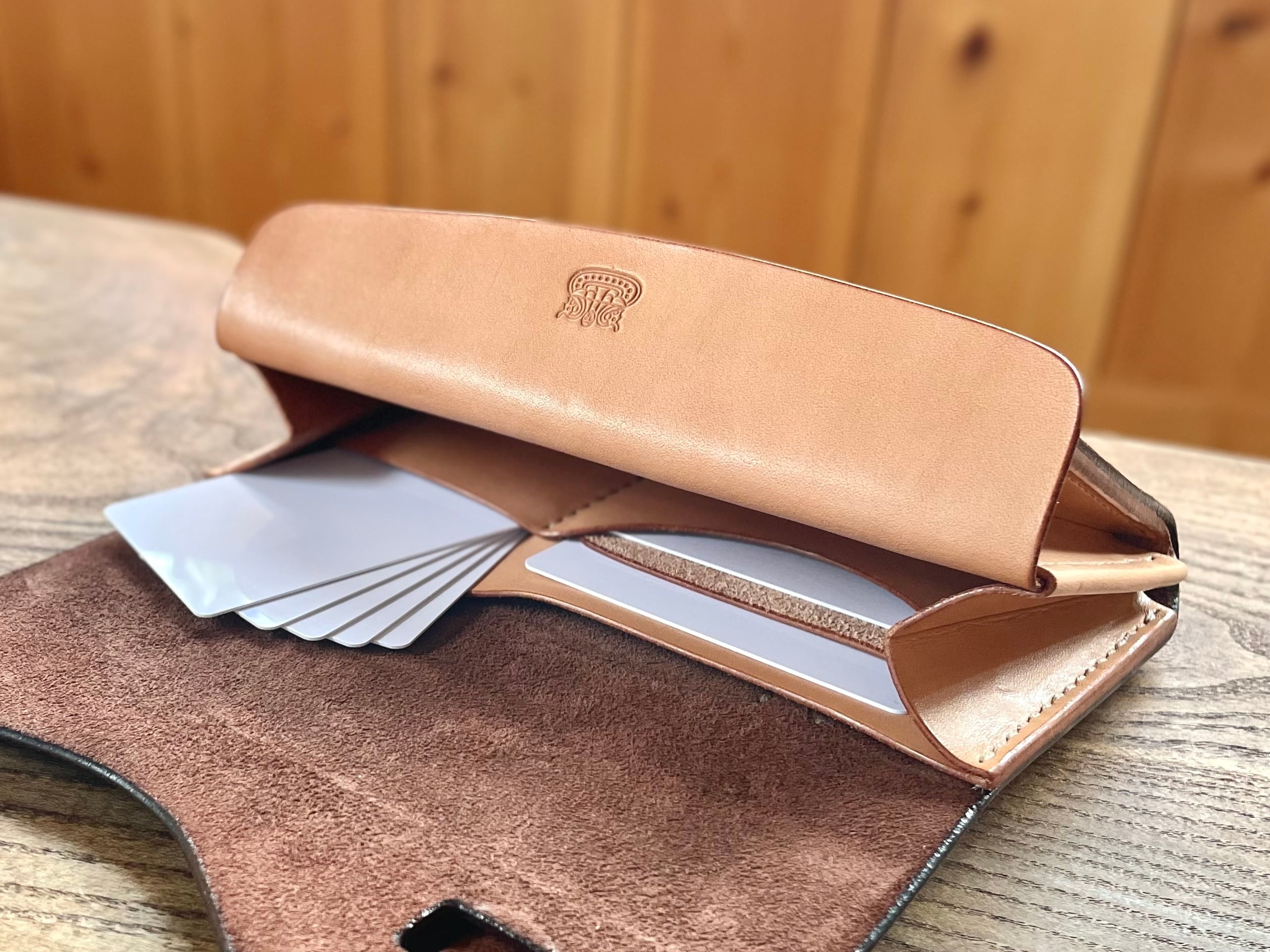 外装に自然な艶のあるサドルレザー、内装にヌメ革を使った手縫い仕立て。どちらも経年変化を楽しめる国産の植物タンニンなめし革を使っています。