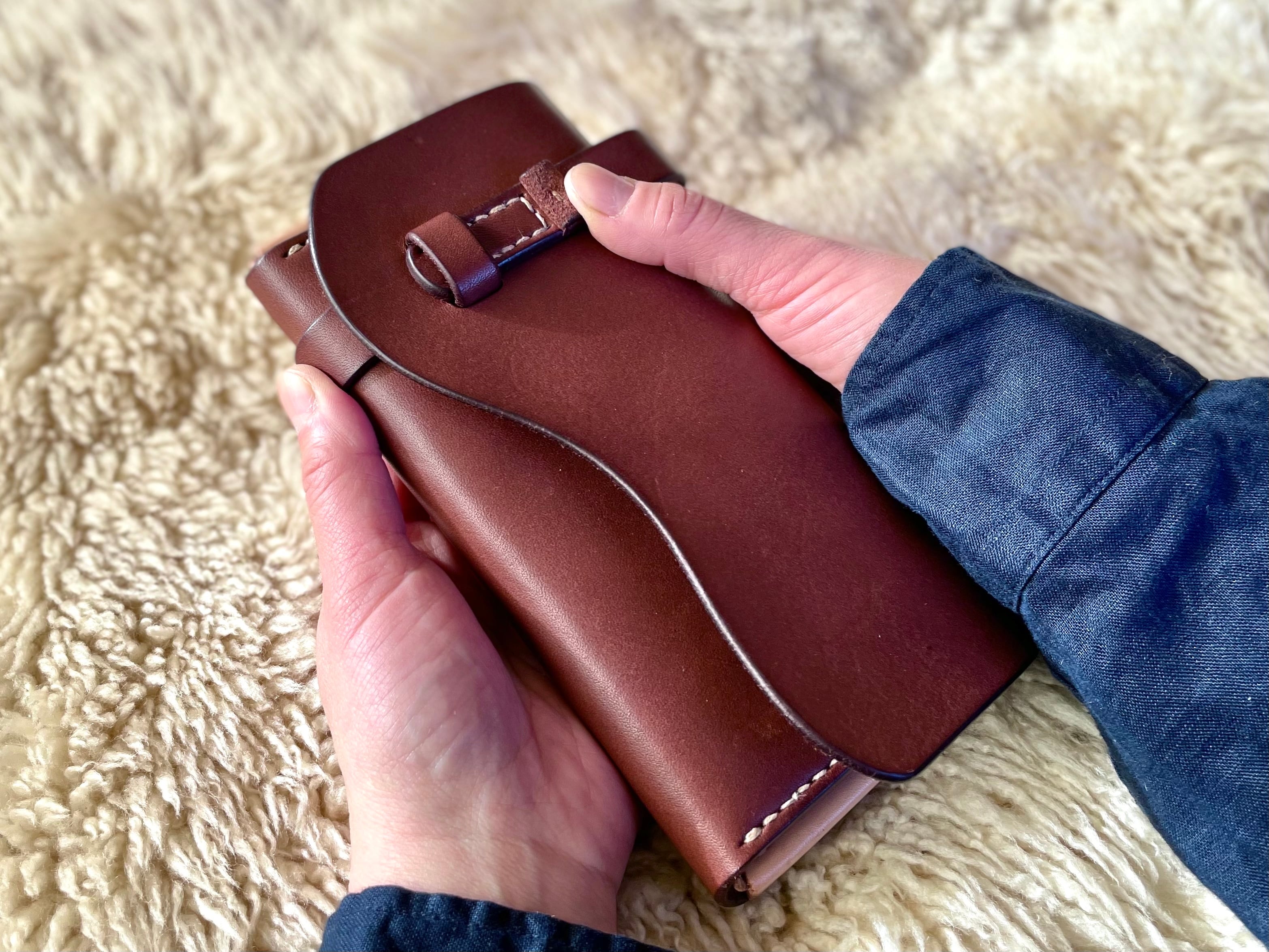 外装に使っているのは、染色したヌメ革をガラスのローラーで磨いたサドルレザー。ヌメ革の質感も持ちながら、磨きによる自然な艶と色の深みに趣がある革です。