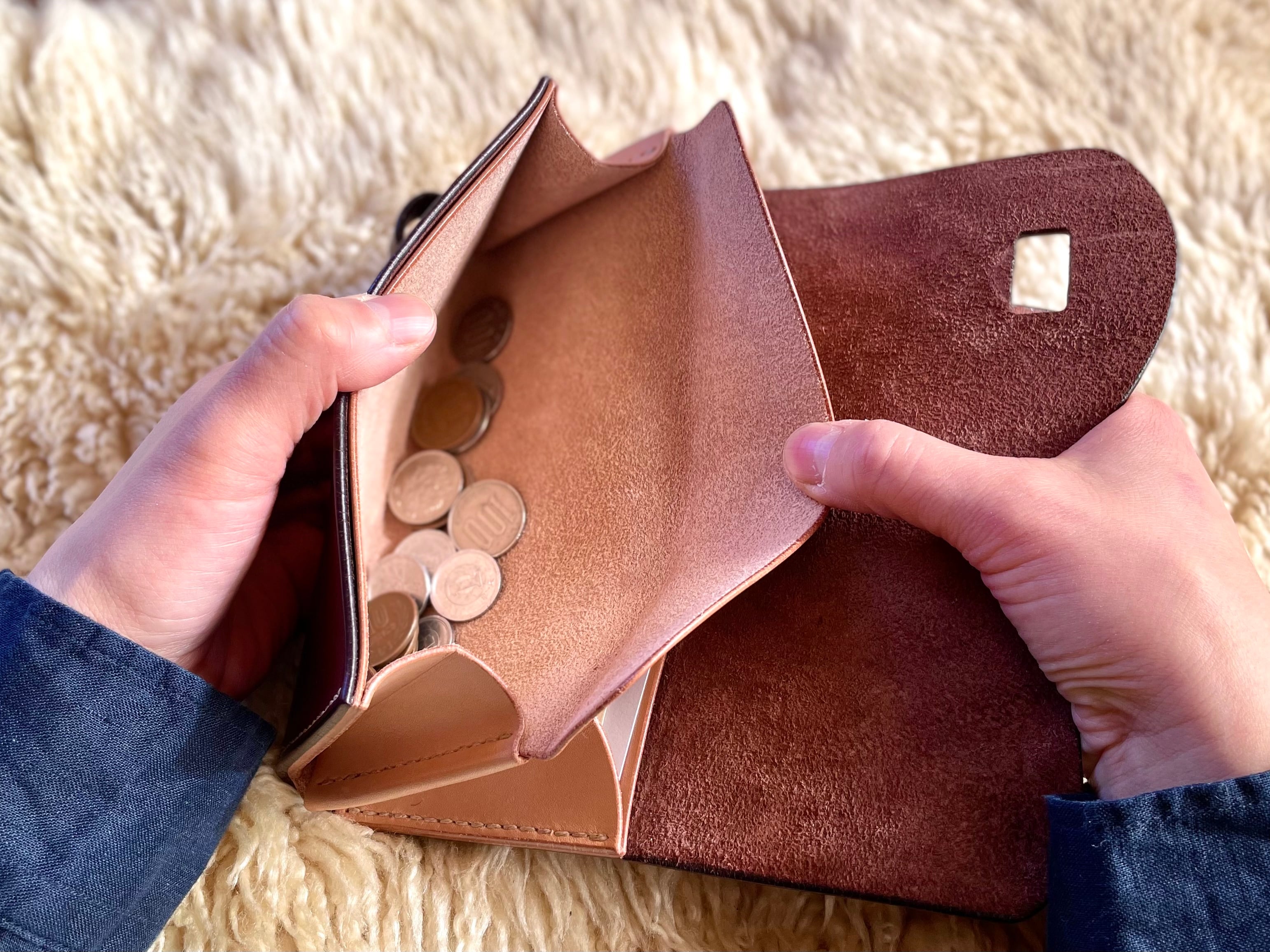 小銭入れのかぶせ(フタ)は、使うことでクセがついて自然に閉じるので、小銭が落ちることはありません。革の力を利用した心地よい使用感を楽しめます。