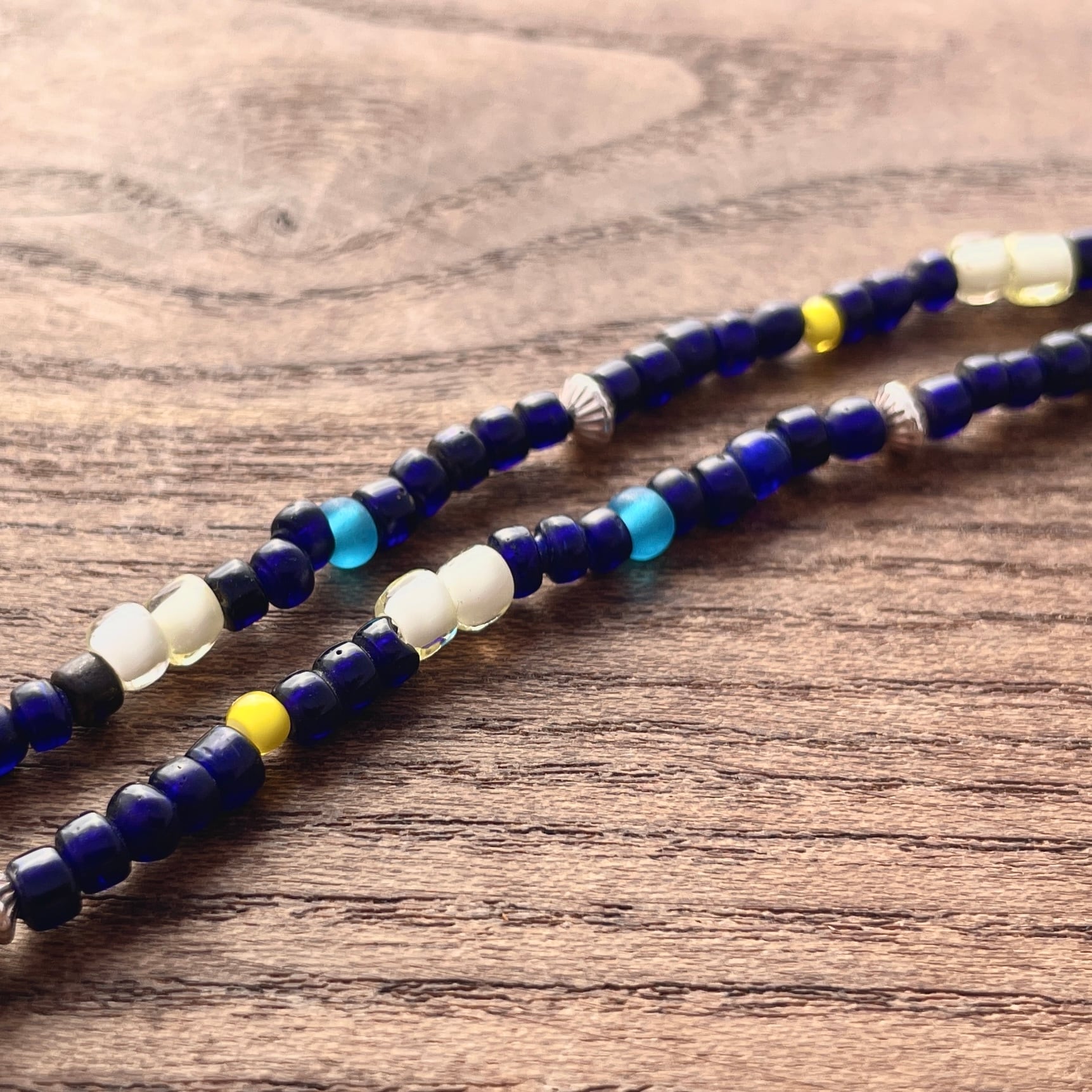紺と水色は19〜20世紀のインド、黄色と透明なホワイトハーツは20世紀のチェコで作られたアンティークビーズ。金属ビーズとフックもシルバー925を使用しています。