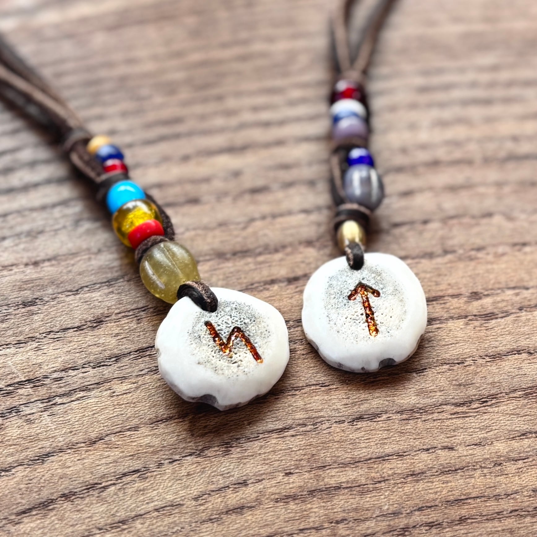 北欧のヴァイキングたちが使っていた16文字ルーンを鹿角に刻んだお守りネックレス。