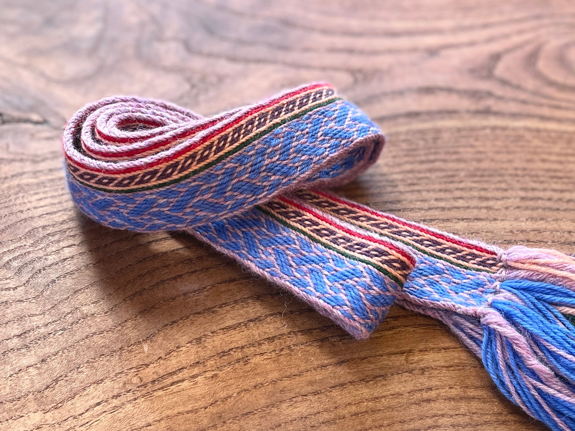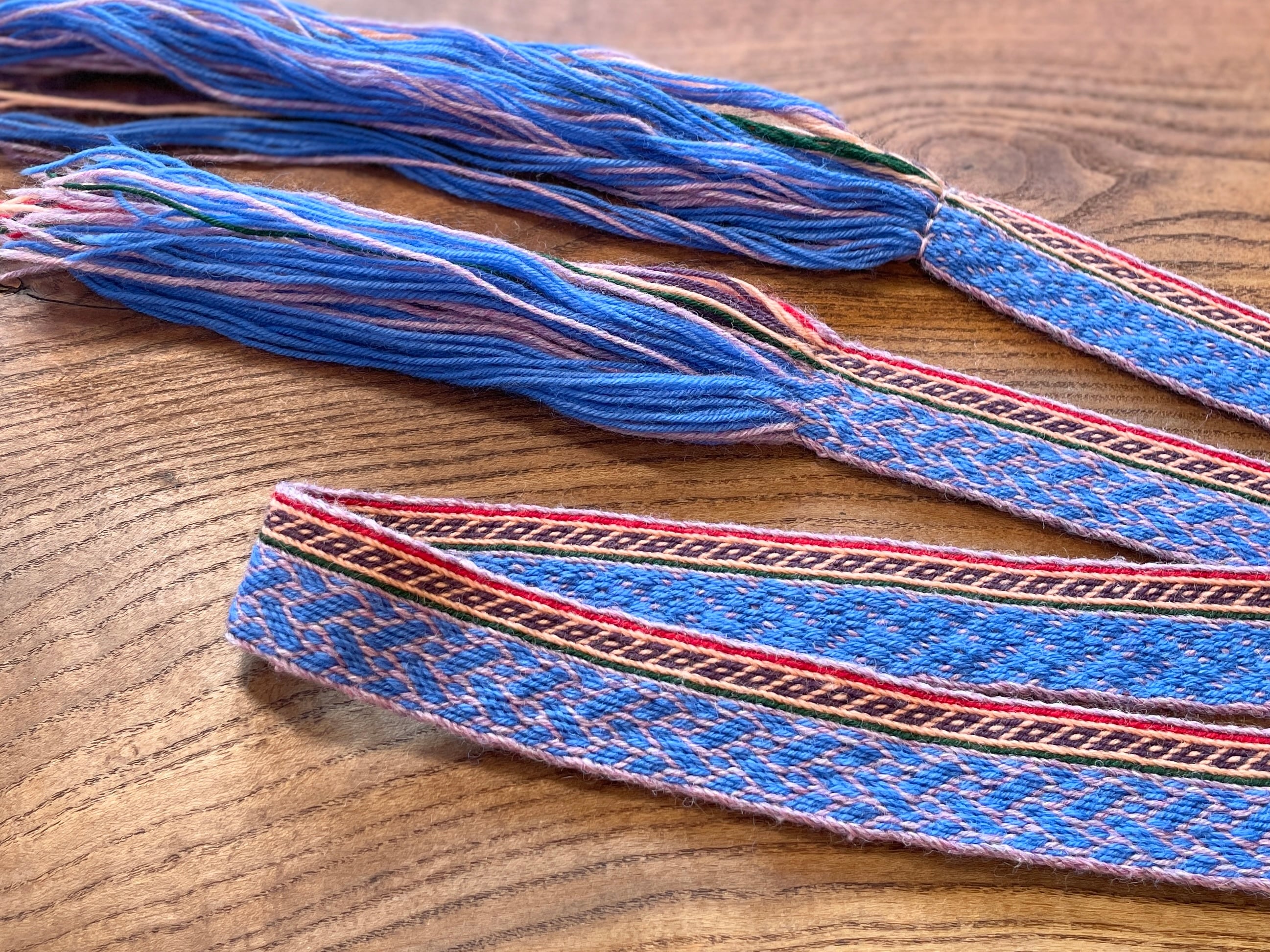 華やかな模様が目を引く、丈夫な手織り紐です。ヴァイキングの手しごと、カード織りで作られています。