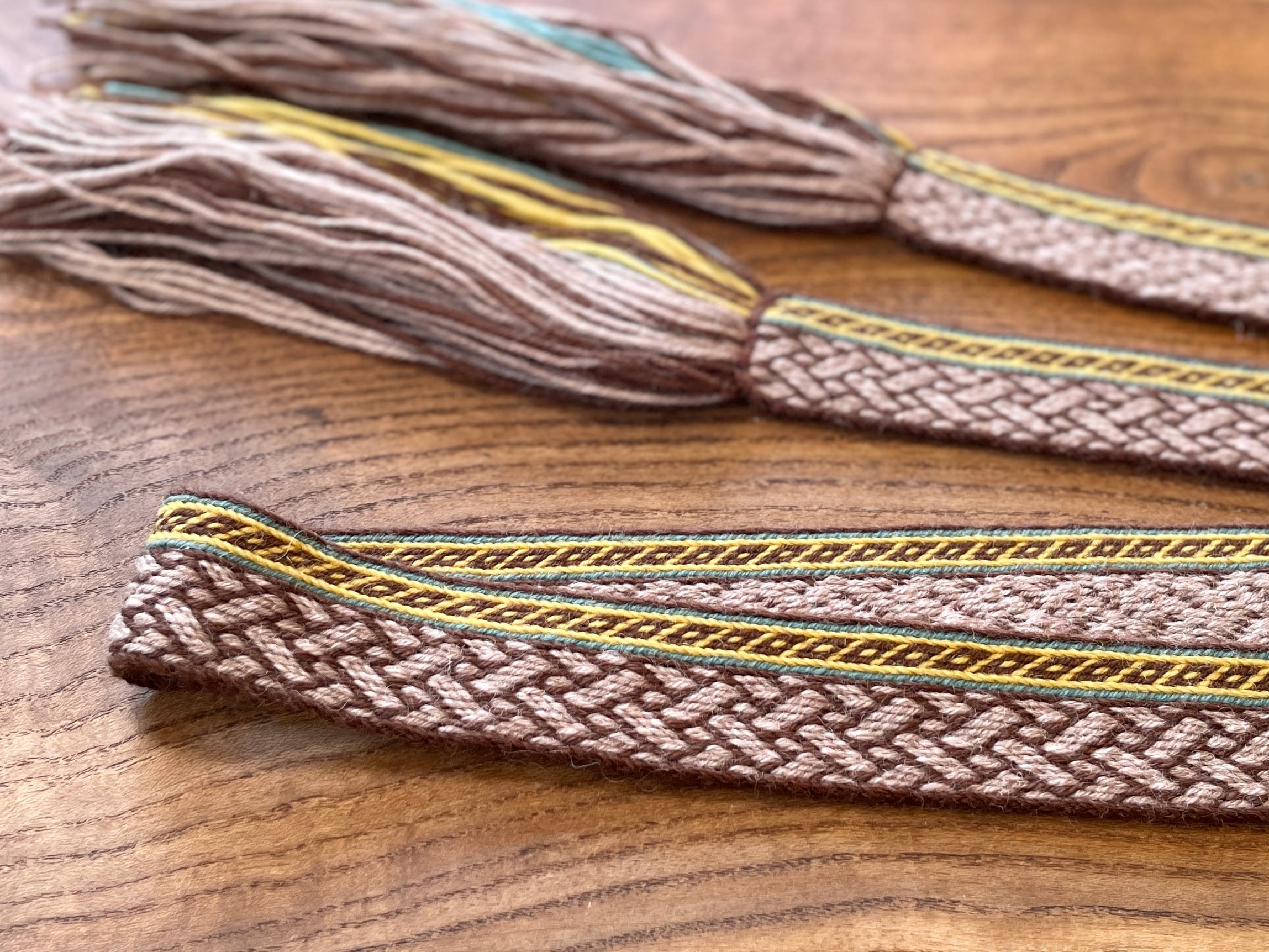 華やかな模様が目を引く、丈夫な手織り紐です。ヴァイキングの手しごと、カード織りで作られています。