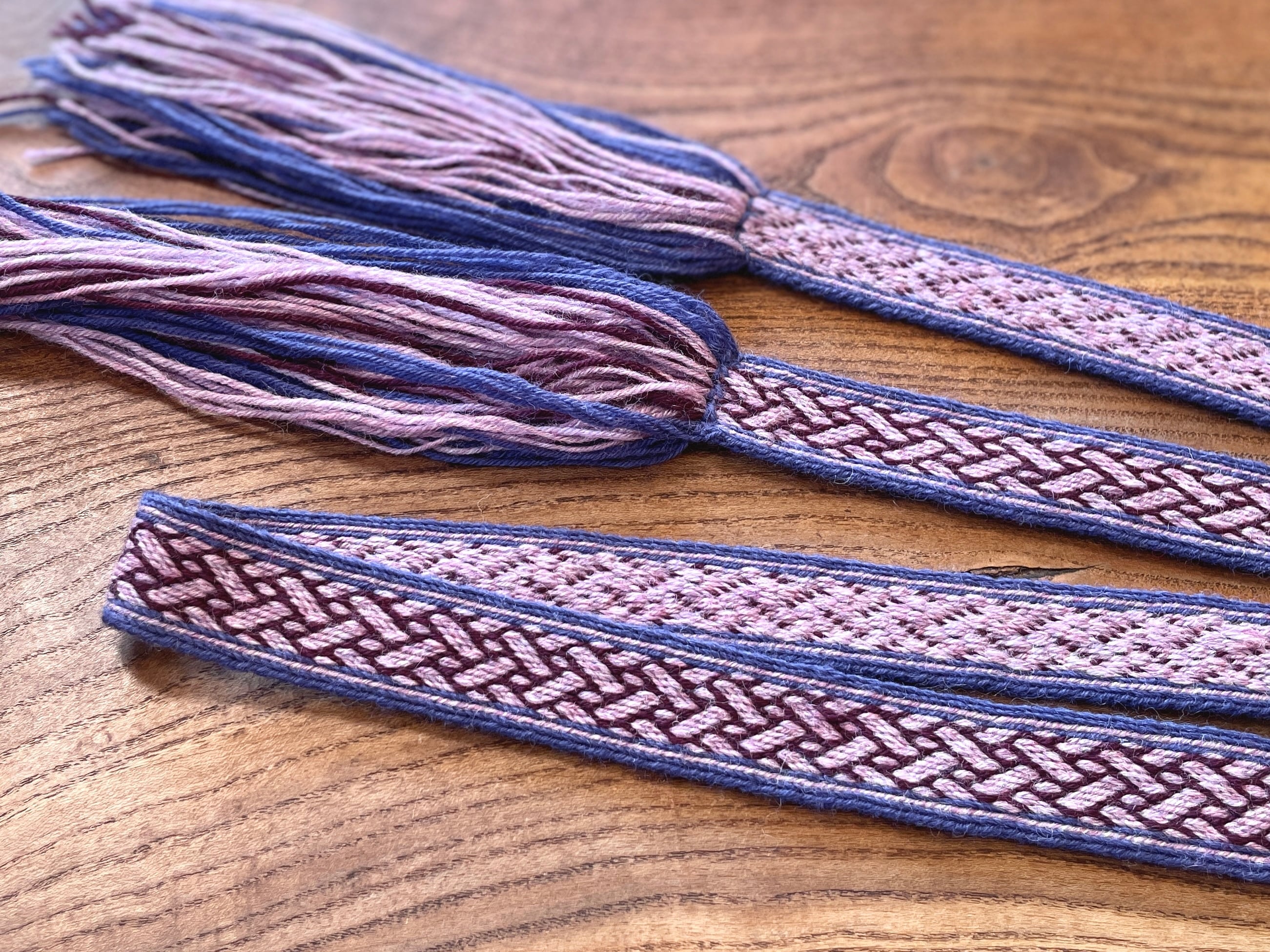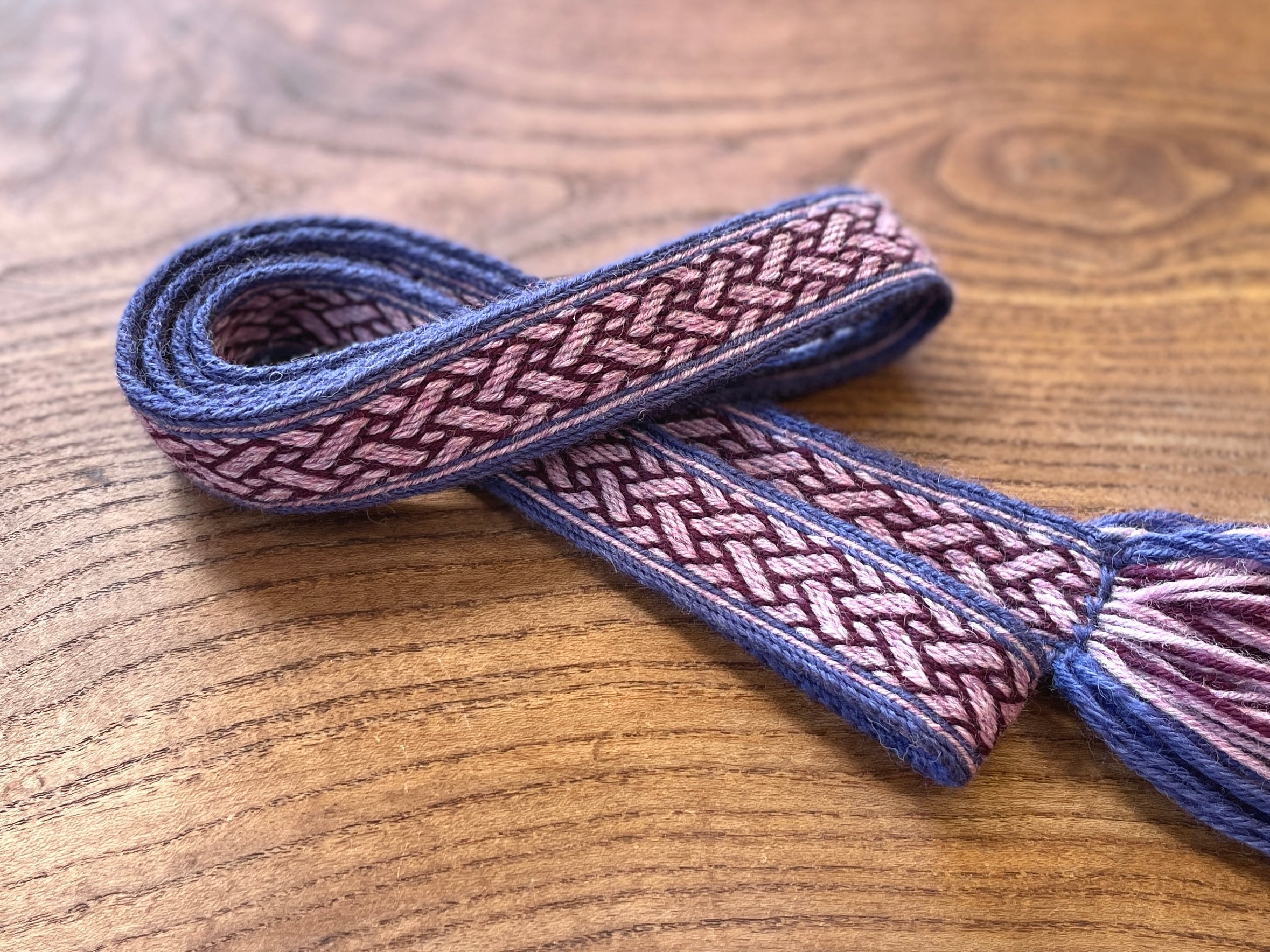 華やかな模様が目を引く、丈夫な手織り紐です。ヴァイキングの手しごと、カード織りで作られています。