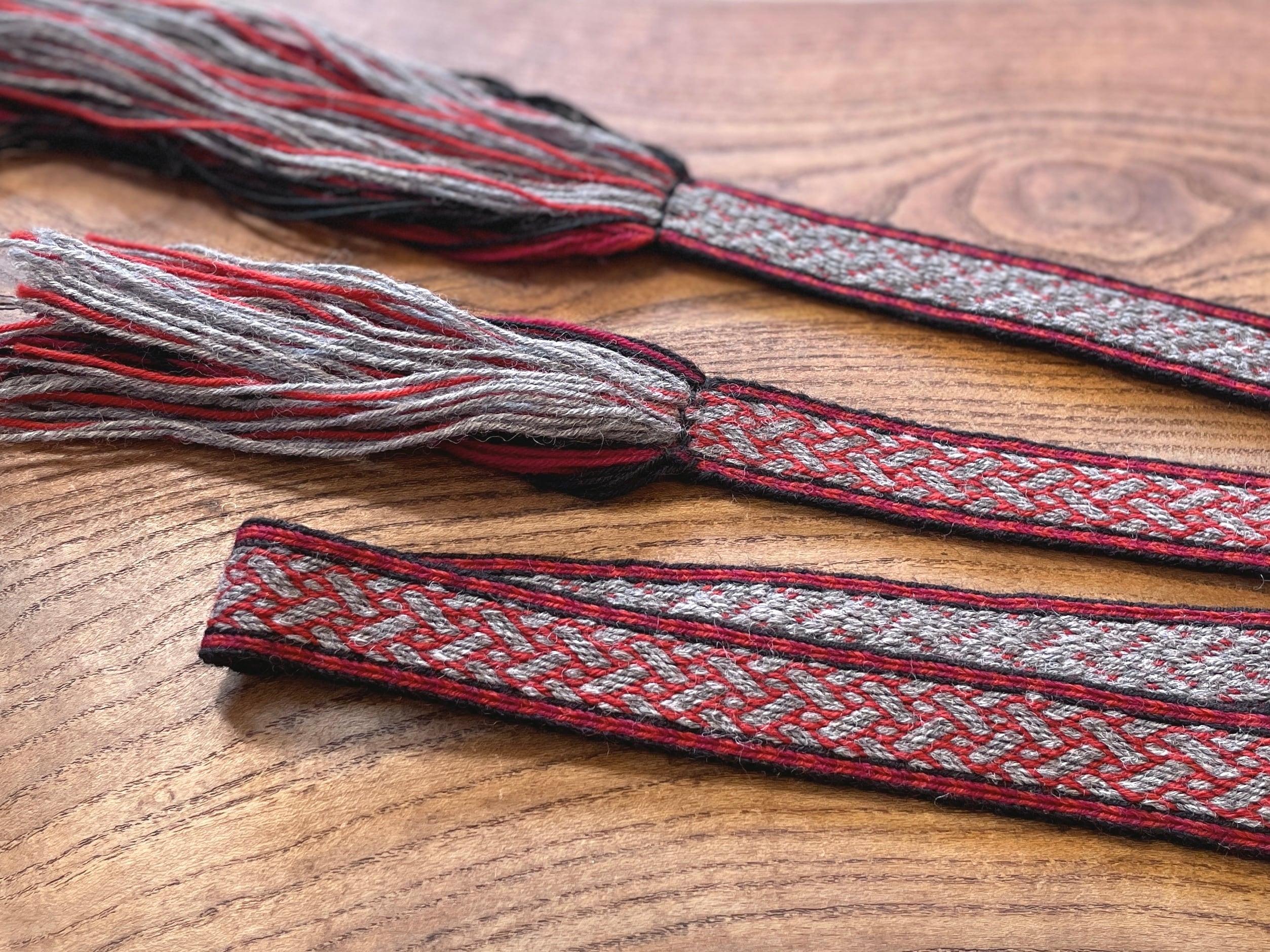 華やかな模様が目を引く、丈夫な手織り紐です。ヴァイキングの手しごと、カード織りで作られています。