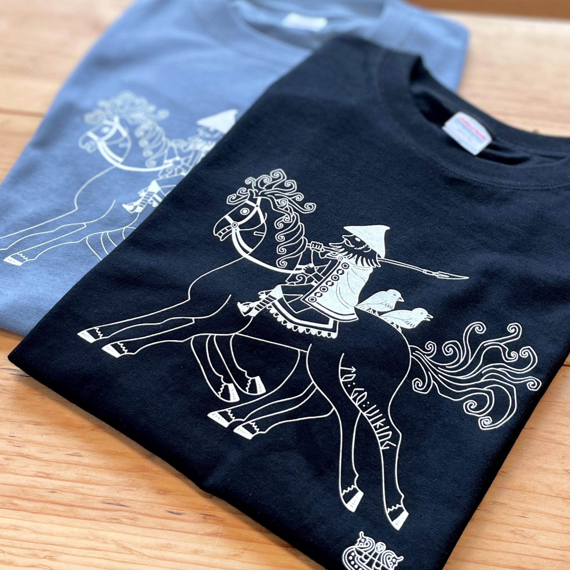 ヴァイキングの北欧神話から、愛馬スレイプニルにまたがって旅をするオーディン神。ワタリガラスのフギンとムニンもお供します。