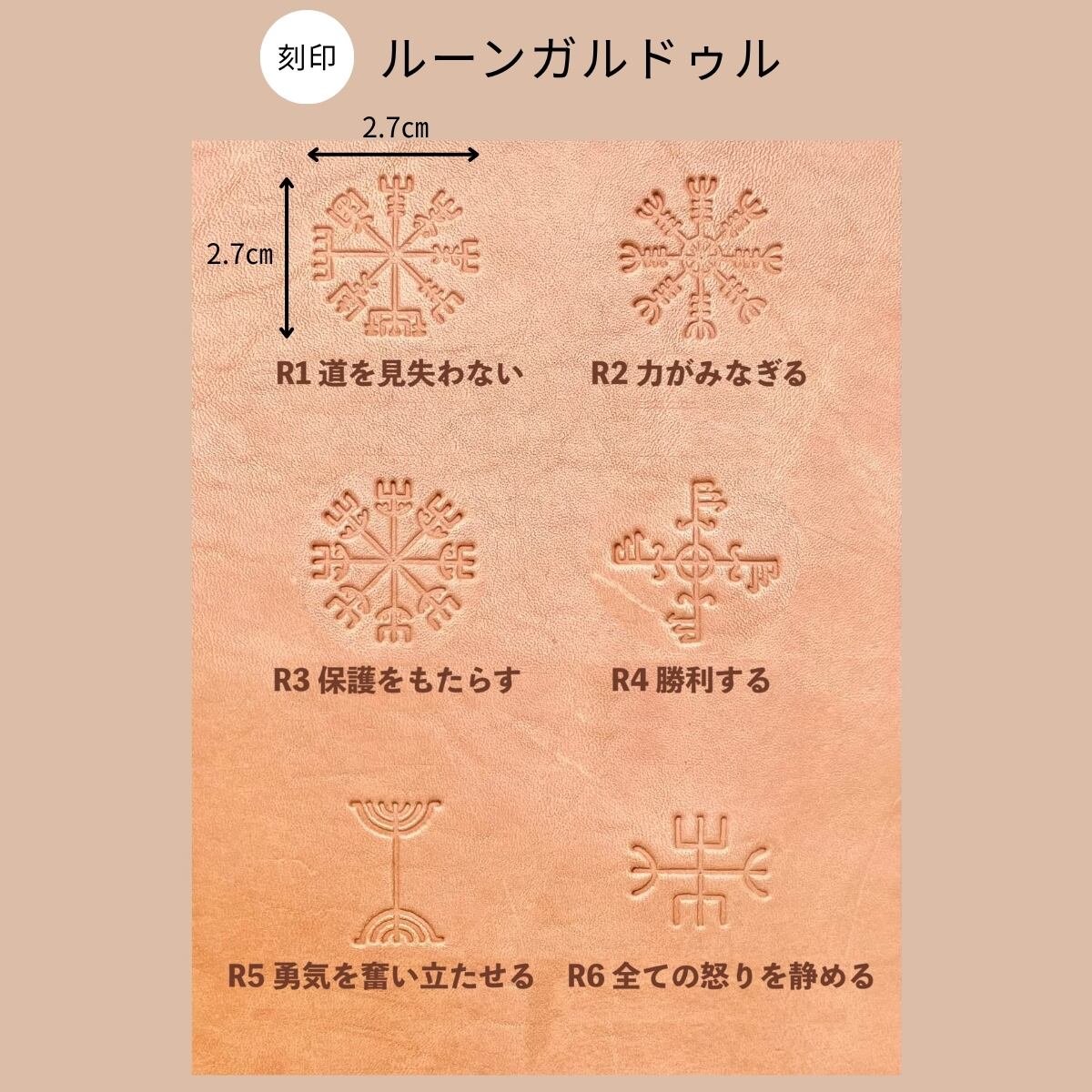 表革にお好きな刻印を入れて製作します。「ヴァイキング模様」「北欧柄」「ルーンガルドゥル」からお選びください。