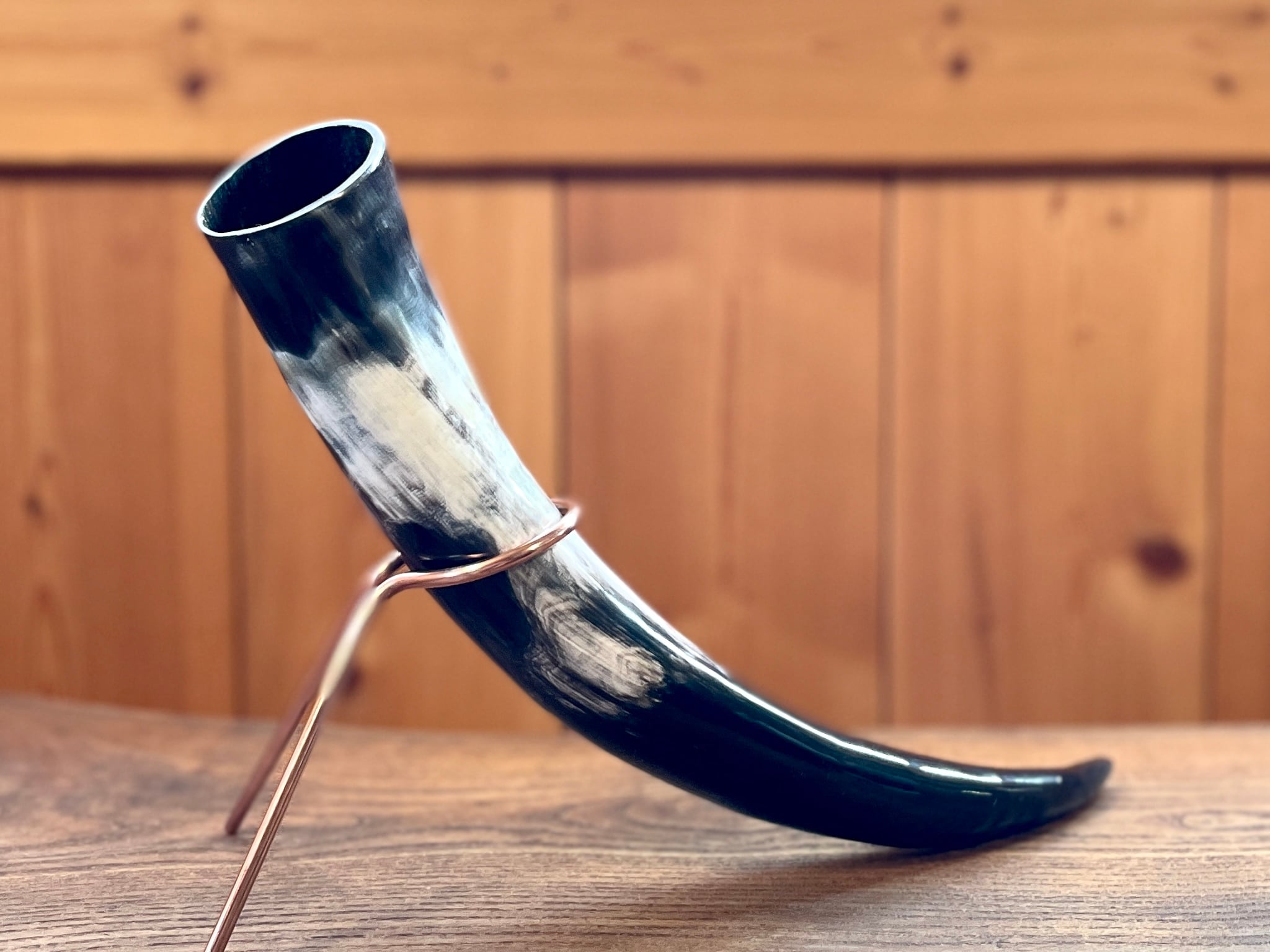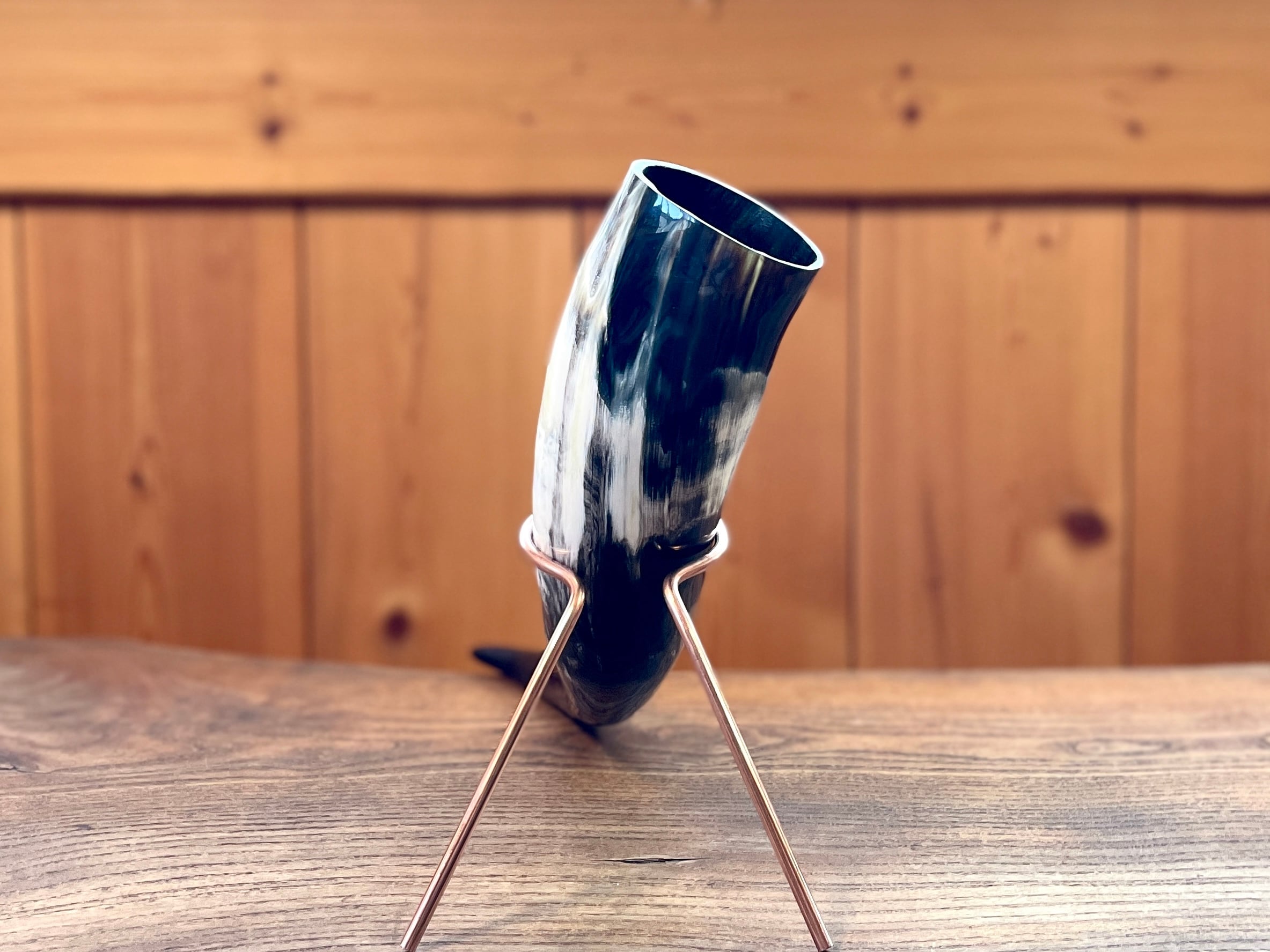 銅のスタンドが付属します。スタンドは、それぞれのドリンキングホーンの太さ形に合わせて1本ずつ手曲げし、長さも調整して作っています。そのためグラつくことなく、しっかりとフィットして立てられます。
