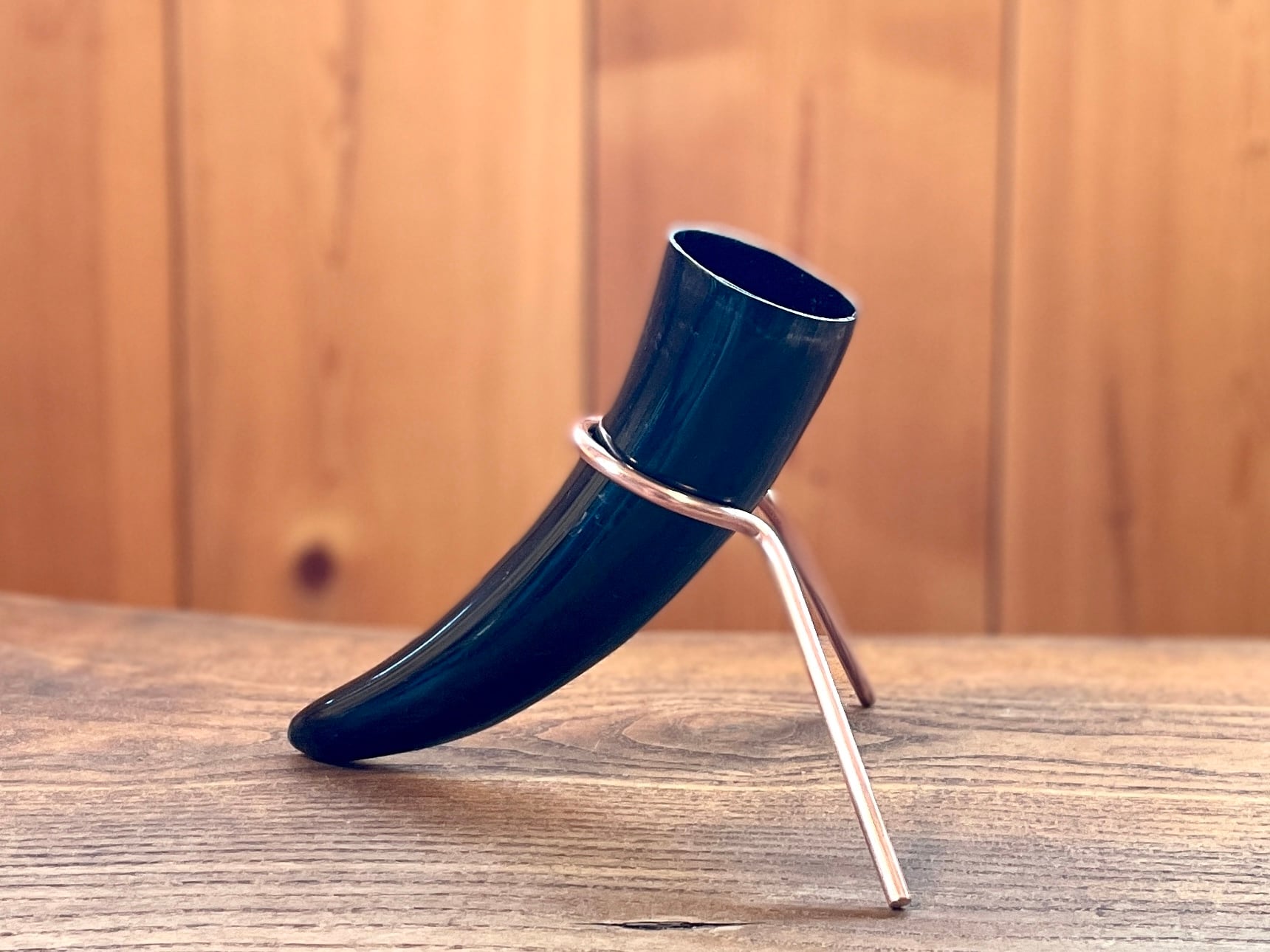 銅のスタンドが付属します。スタンドは、それぞれのドリンキングホーンの太さ形に合わせて1本ずつ手曲げし、長さも調整して作っています。そのためグラつくことなく、しっかりとフィットして立てられます。