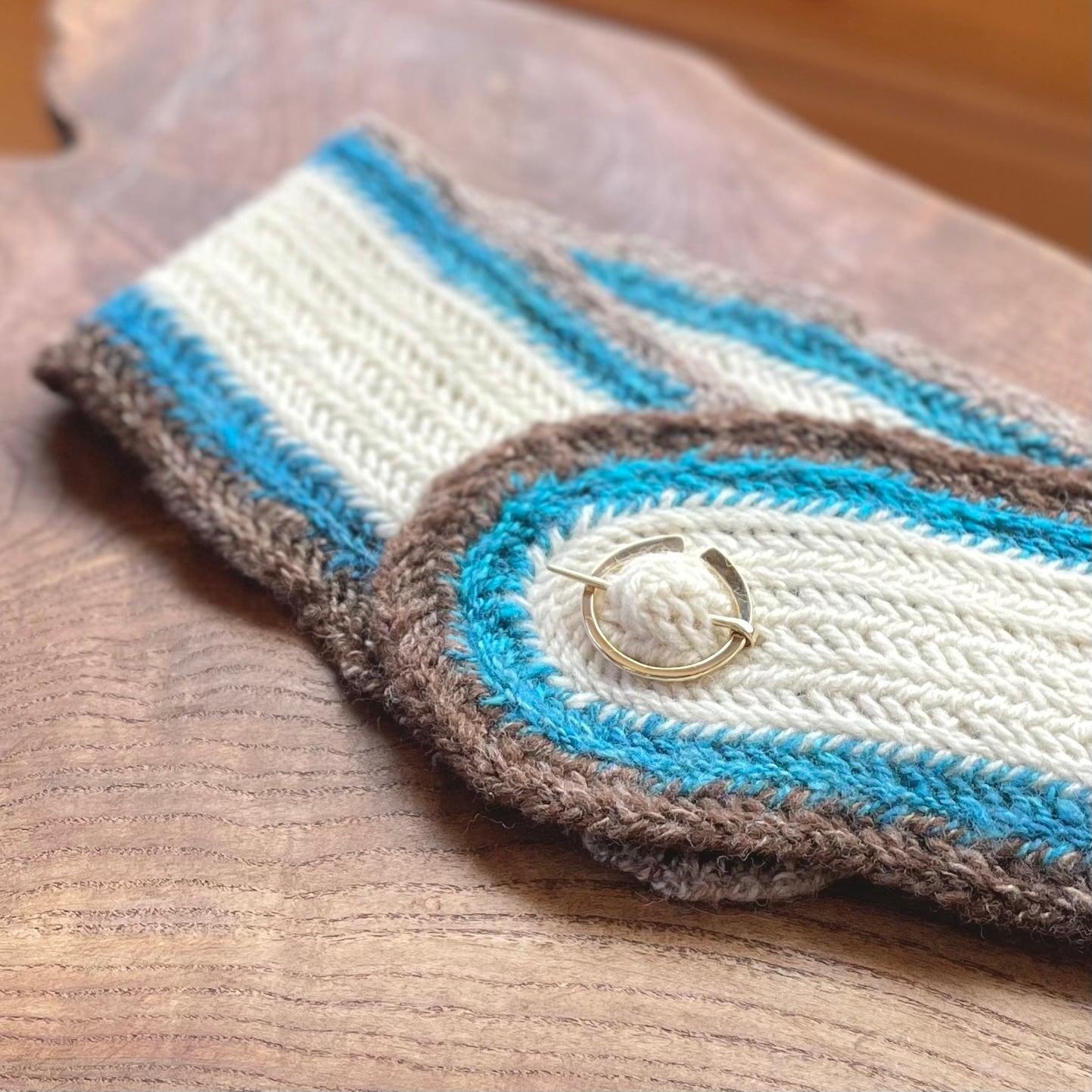 縁回りのブルーとブラウンは、味わい深い手紡ぎ糸で編んでいます。ウールは保温性も高く、蒸れにくく快適。冬場に気になる静電気もほとんどおきません。
